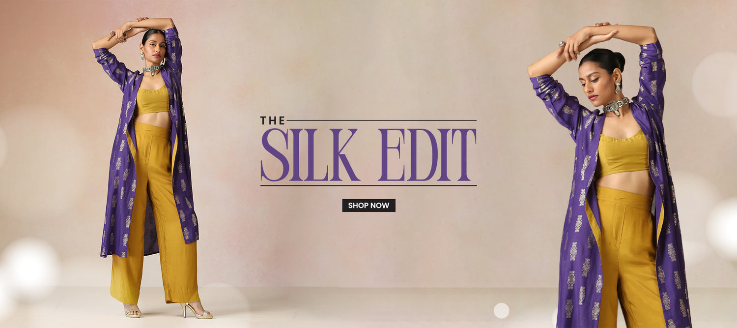 trueBrowns Purple Peach Jaal Print Muslin Silk Flared Pants Co-ord Set